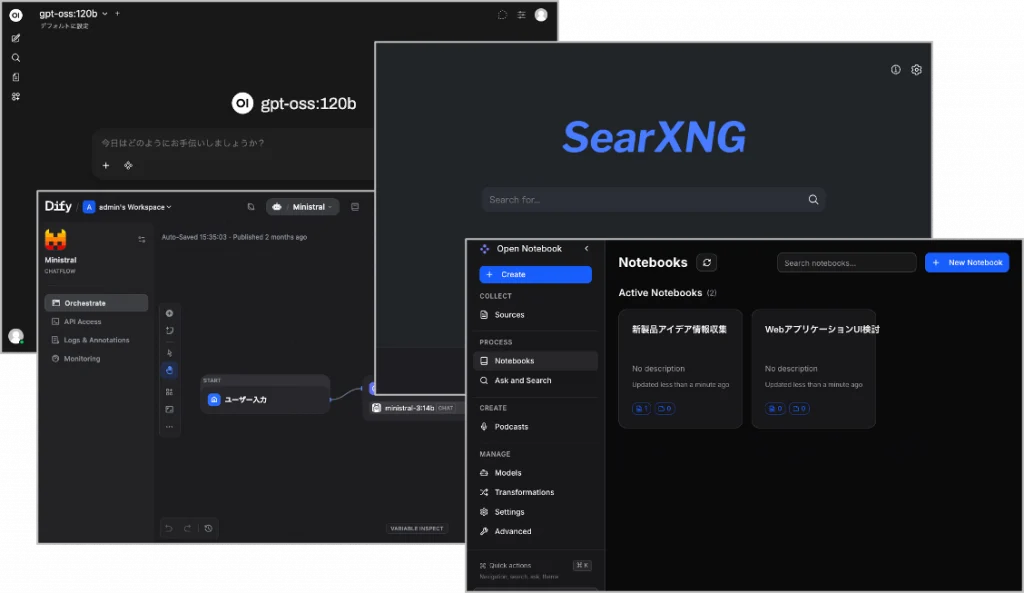 OpenWebUI、SearXNG、Difyなどのオープンソースソフトウェア(OSS)を組み合わせ、以下の機能をローカル環境で構築します。